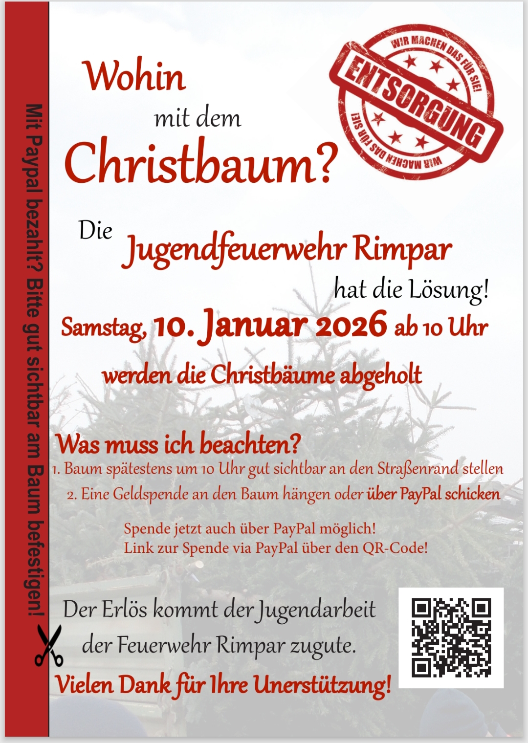 Die traditionelle Christbaumsammlung findet in diesem Jahr am Samstag 10. Januar 2026 ab 10 Uhr statt. Dabei sammeln wir alle Christbäume im Ortsgebiet Rimpar ein.